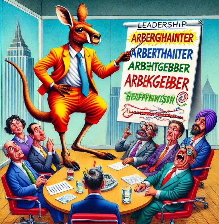 The kangaroo's satirical commentary isn't just a critique of language—it's a critique of leadership and how we perceive roles within a company. The inversion of "Arbeitnehmer" and "Arbeitgeber" reflects a broader misunderstanding of leadership. Too often, leaders are seen as the ones who bestow opportunities upon employees, rather than recognizing that leadership itself is supported by the hard work of those they lead.